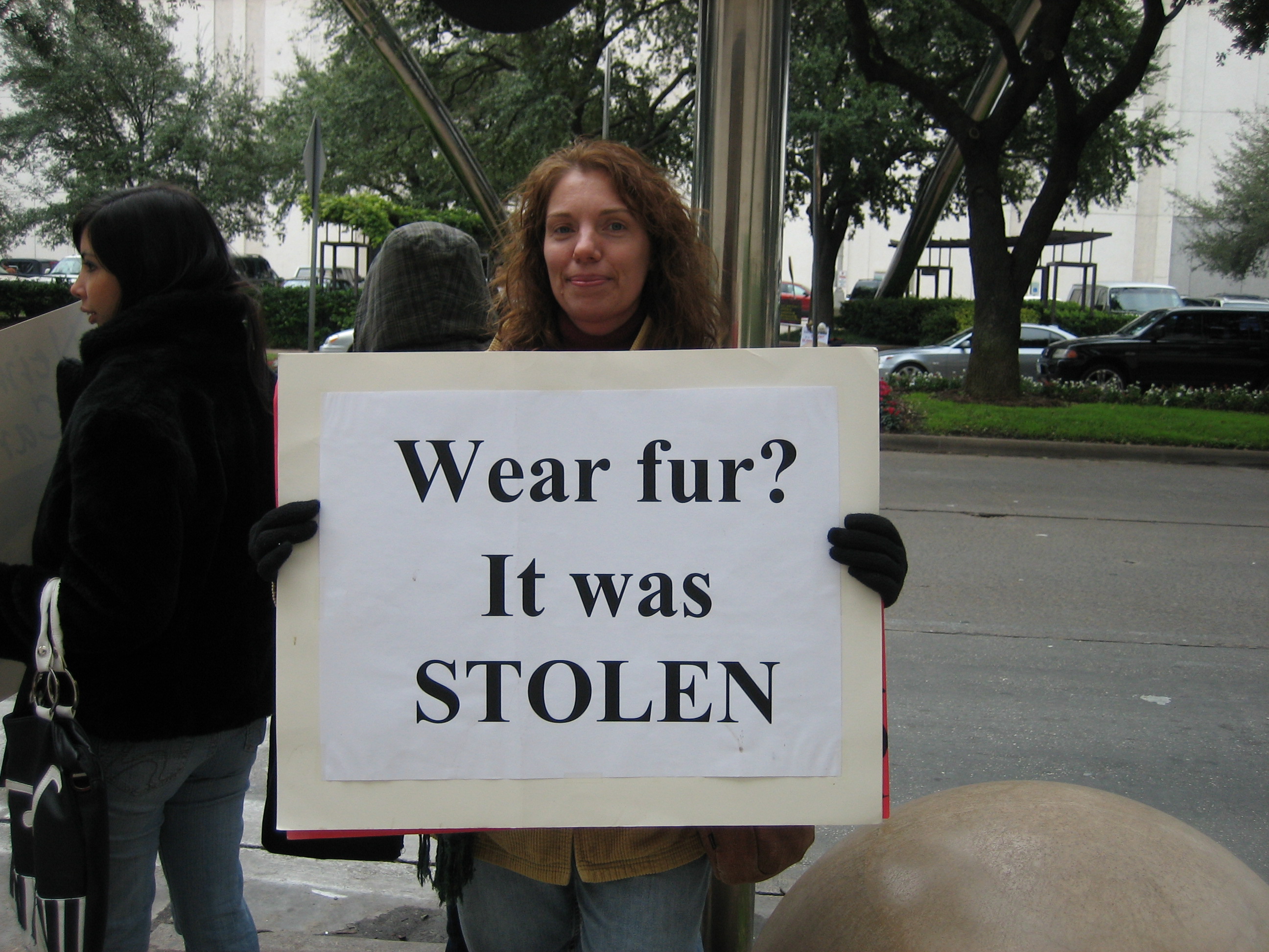 After years of swearing to do it I finally participated in my first protest. It was freezing cold by Texas standards but I was well equiped with winter gear as a proper Minnesotan. It was peaceful with more positive remarks than negative from the passersby. We protested the approach to Neiman Marcus at the Galleria in Houston for their support of inhumane fur trade - especially from China where they practice live skinning with no incapacitation of the poor animal involved, quite often a dog. Hopefully we influenced some people's thoughts on the subject.