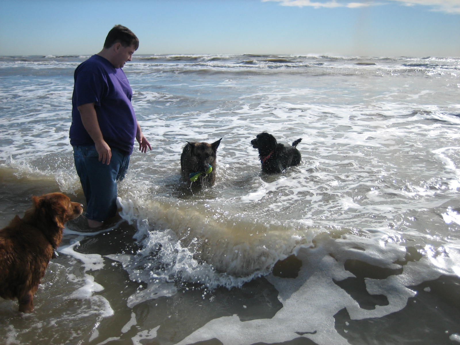 Believe it or not this a a sunny day in January at a beach in Galveston. Freya most likely brought the toy in which Jake promptly stole when she got to the shallows. Bear being more sensible stayed by the humans because MAN was the water COLD.